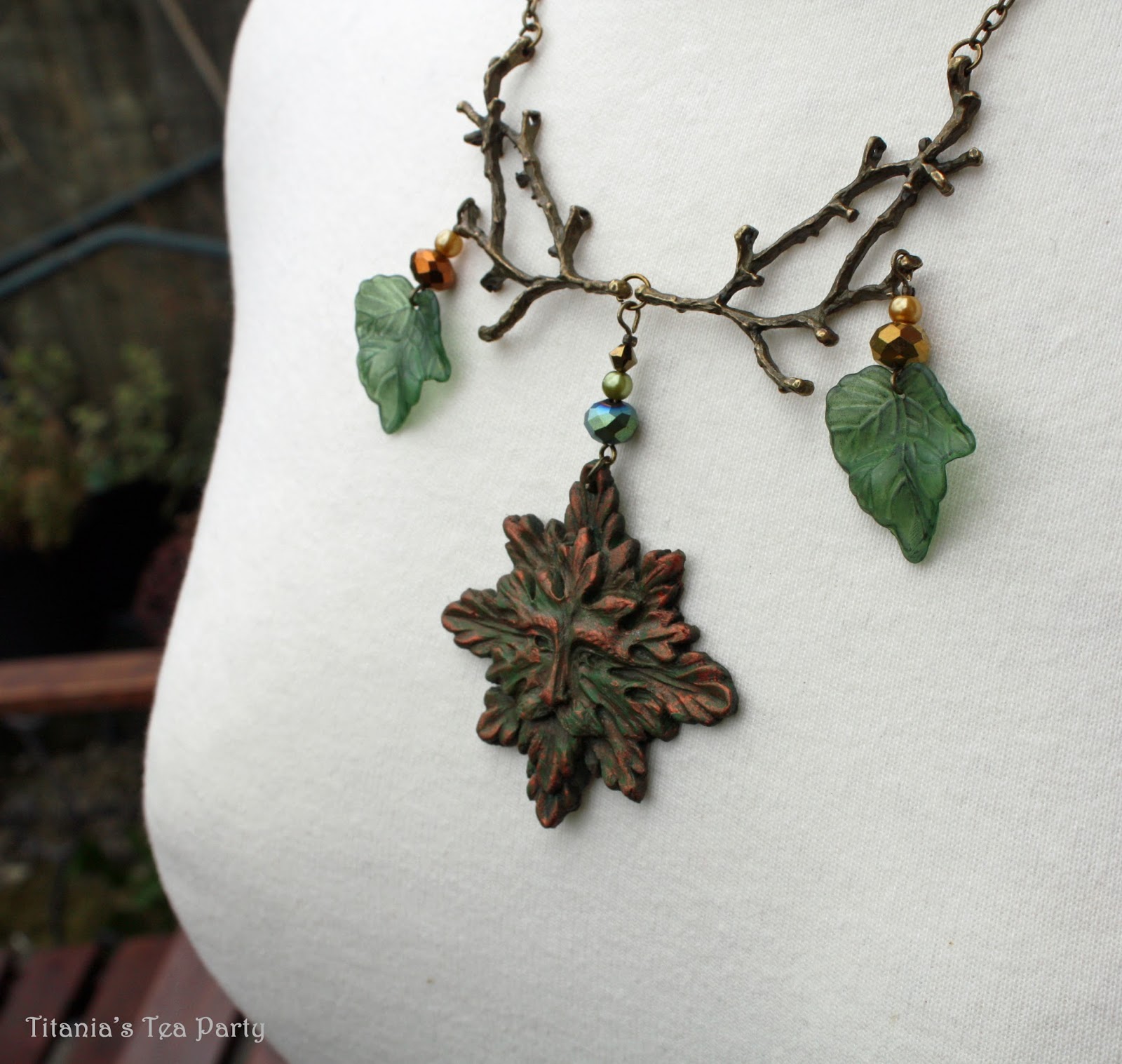 It features a Green Man pendent that I made out of polymer clay, painted with acrylics, aged and varnished.
